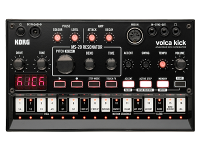 The volca kick is an analog kick generator that’s made for sound design. An analog circuit based on the powerful resonant sound of the original MS-20 filter, it lets you create a wide range of kick sounds only possible through analog circuitry, ranging from solid kick drums to crisp kick basses. The 16-step sequencer, a distinctive feature of the volca, now has a new Touch FX feature that lets you control an effect instantly, giving you even more live performance potential. Experience the stunning power of an analog kick that cannot be obtained from a plug-in or a sample.